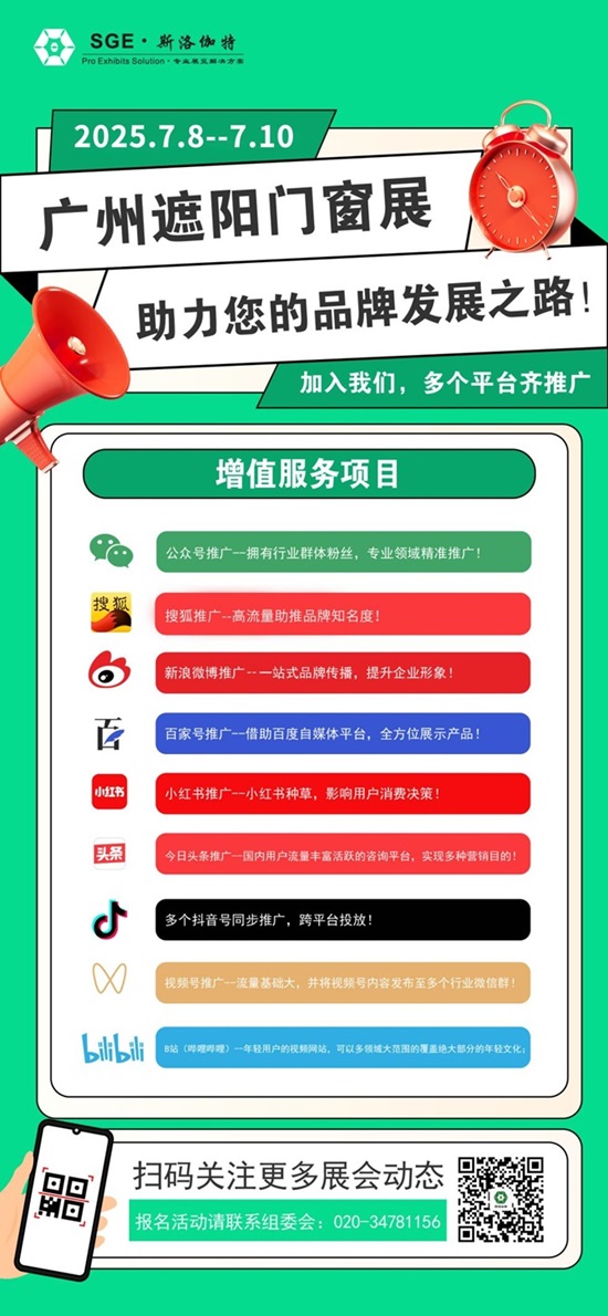 广州遮阳门窗展于每年的7月8-10日在广州国际采购中心举办,依托琶洲国际会展商圈,秉承宗旨,汇聚门窗纱窗、建筑遮阳、电动门窗、别墅门楼梯、户外建材、道闸停车场系统、阳台定制、别墅大宅等领域,在这里,您将网罗遮阳门窗、新型建材、智能设备等全品类产品。从高端定制到普惠精品,从前沿技术到成熟方案,一站式满足多元采购需求。